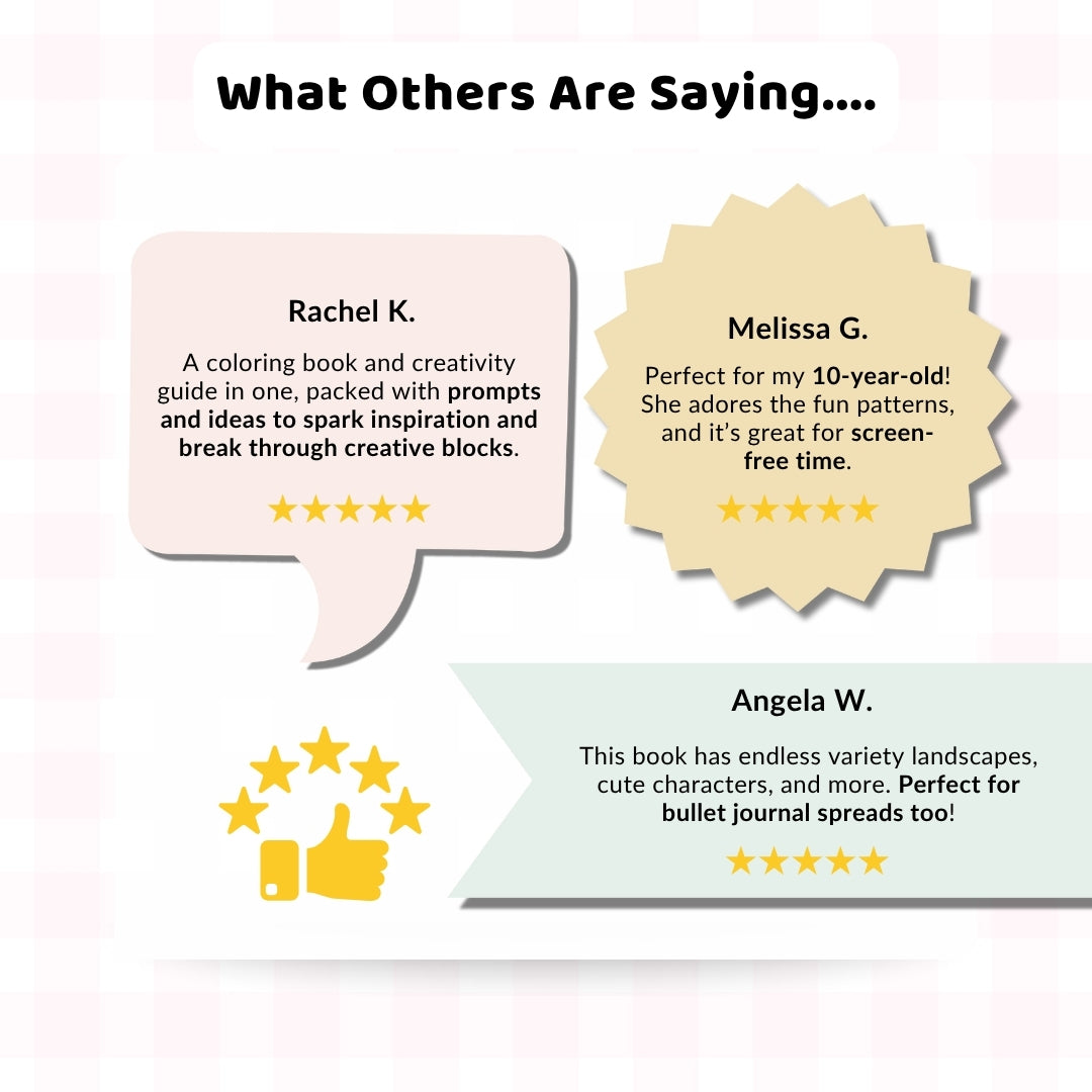 - β 215+ Pattern Pages: Cute animals, nature scenes, and whimsical doodles for endless art inspiration.