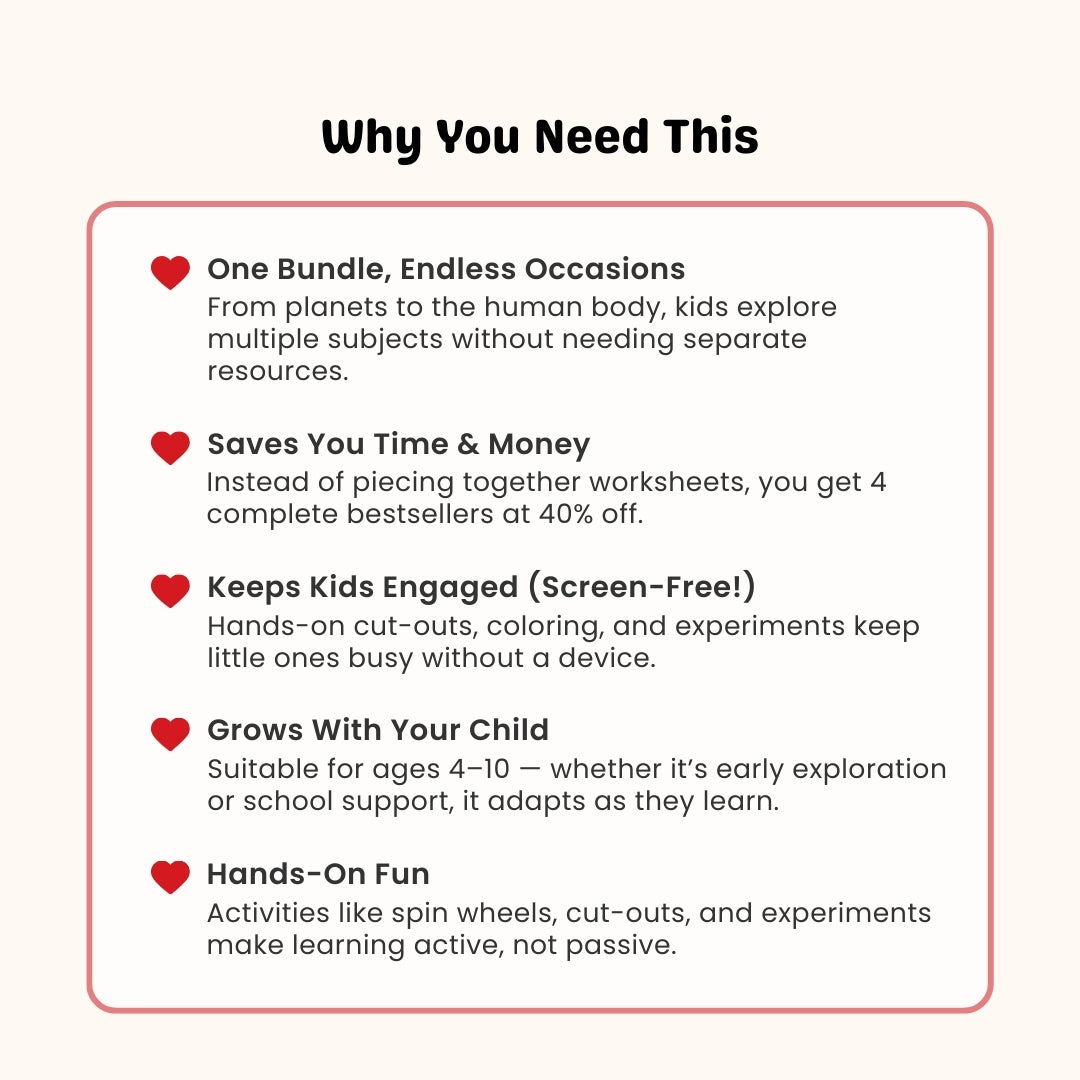 A joyful, brain-boosting bundle (774+ pages) that sparks curiosity—from the solar system and moon phases to experiments, life science, and anatomy.