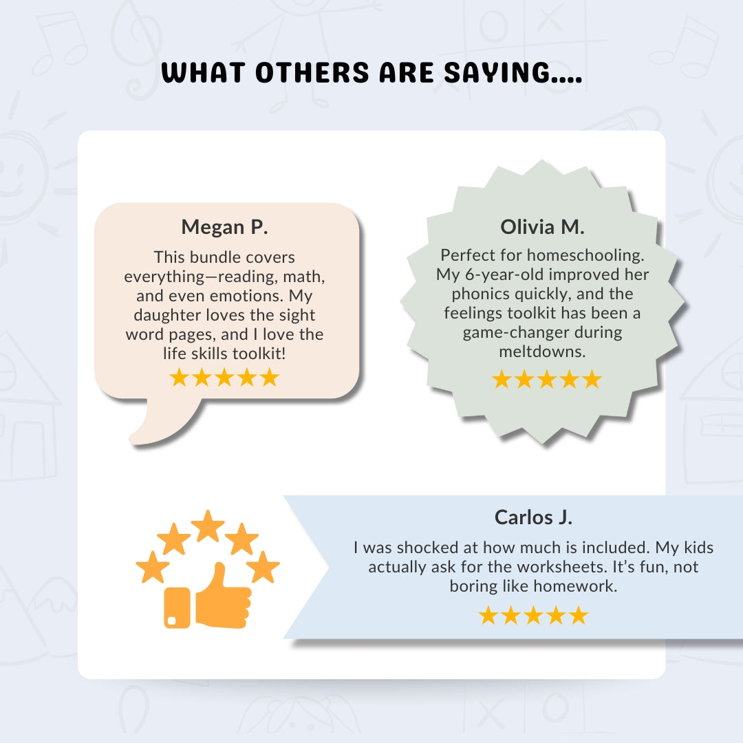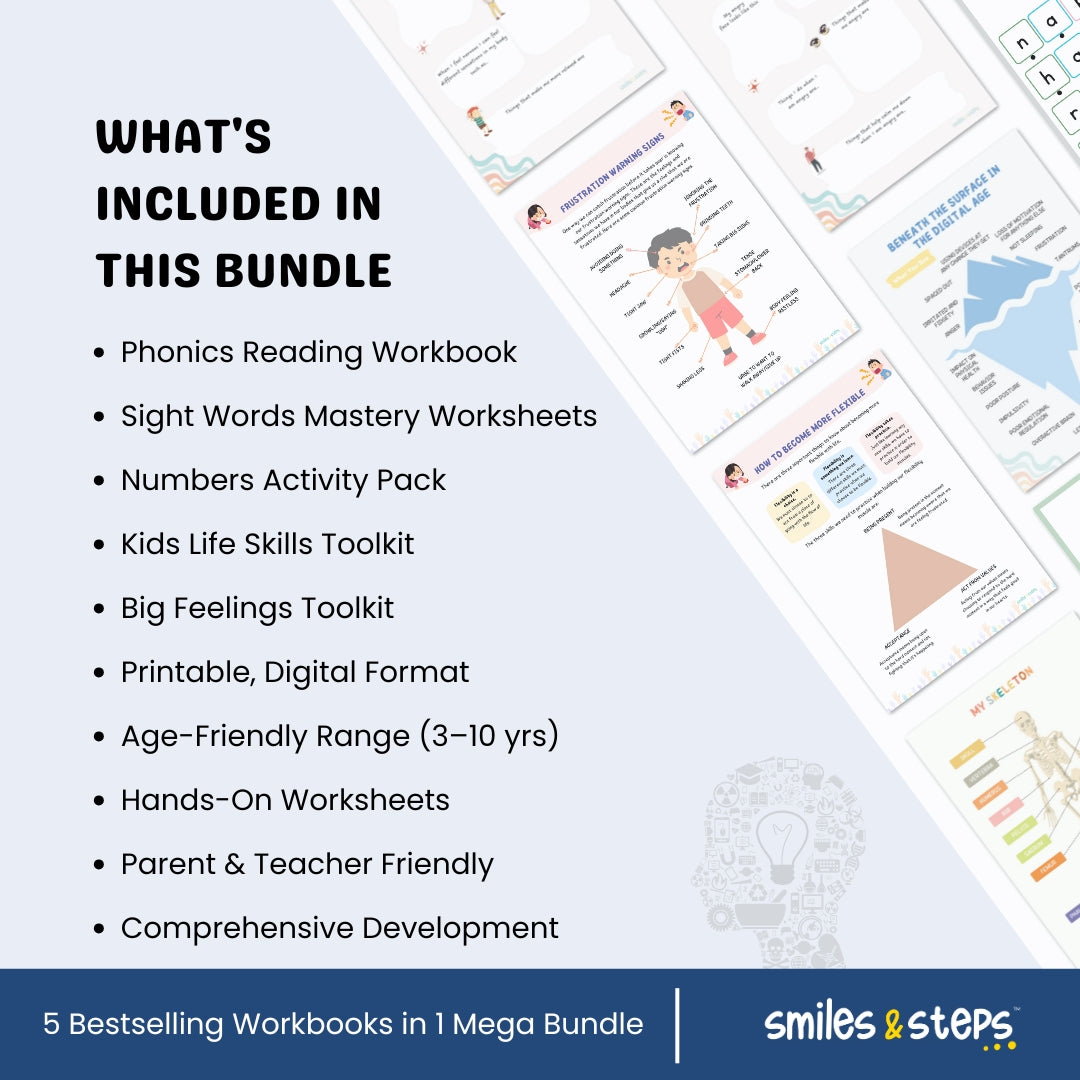 A joyful, brain-boosting toolkit of 5 engaging resources that spark curiosity and build real-world skillsβphonics, sight words, numbers, emotions, and life skills.